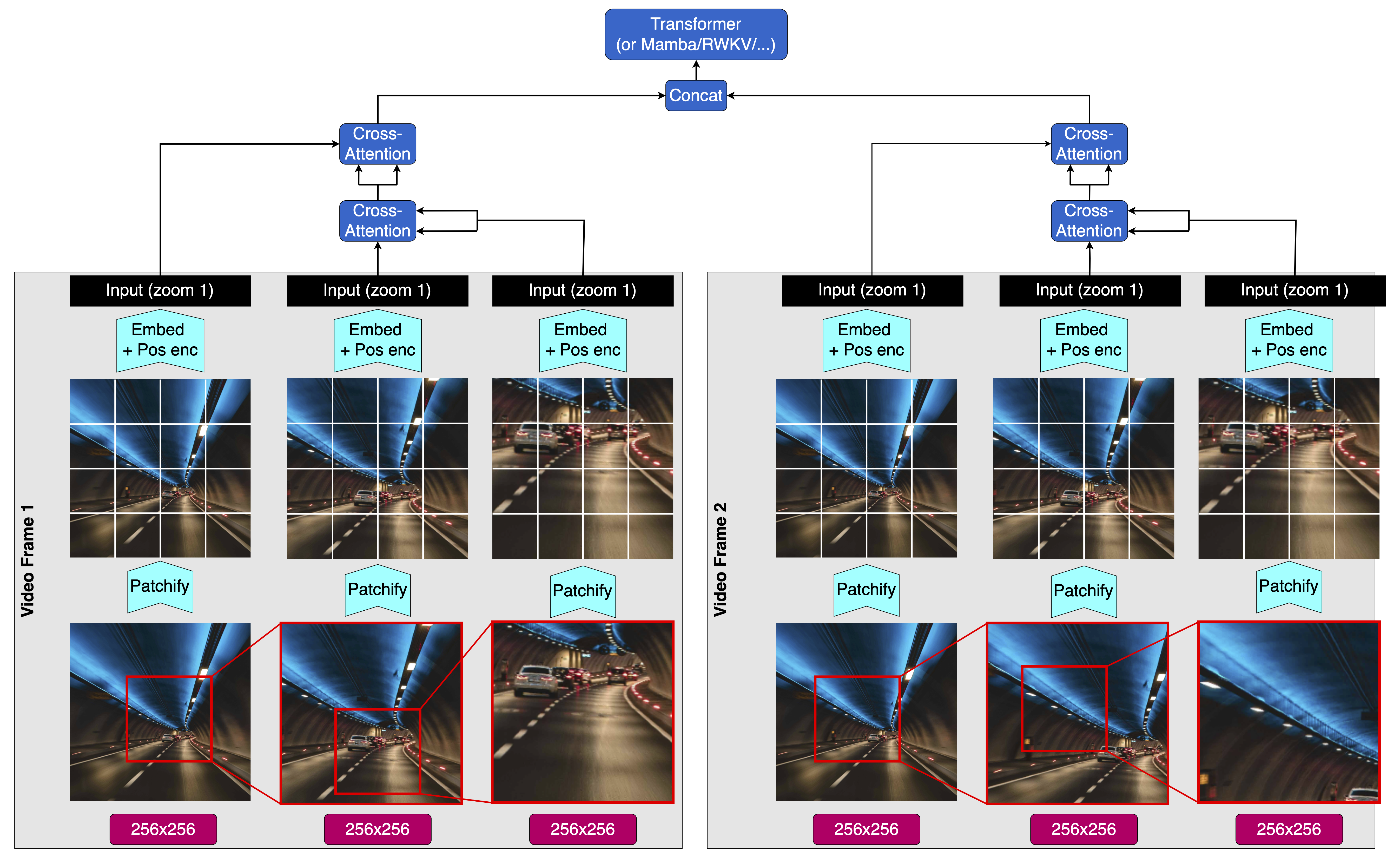 We now only need positional encodings to signify the relative position of the cutout to the center of the image, and the relative position of each token within a cutout / the full image. Then, we have the full-image-stream as the main input with the normal positional encodings that simply denote the relative position of each token within the image, and the frame-number of the image in the video.