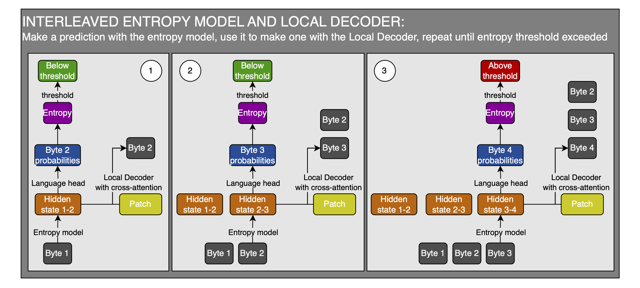 - Else, you append the predicted byte to the inputs and go to step 1 with the new input-byte sequence (and use the Local Decoder’s kv-cache of the previous byte predictions in the current byte prediction)
